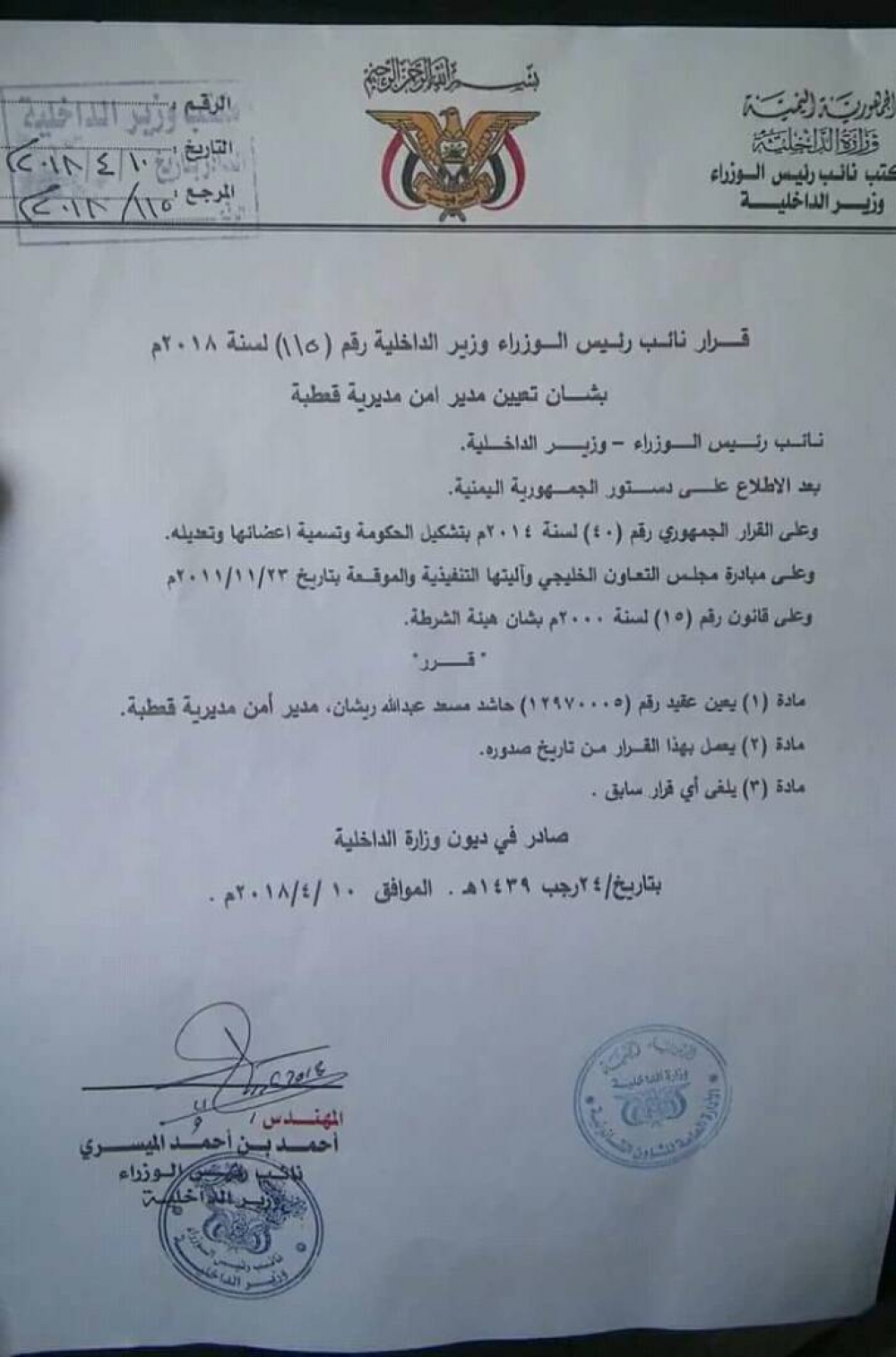 وبحسب المادة(1) اصدر القرر(115) لسنة 2018م لوزير الداخلية بتعيين العقيد حاشد مسعد عبدالله ريشان مديرا لإمن مديرية قعطبة.