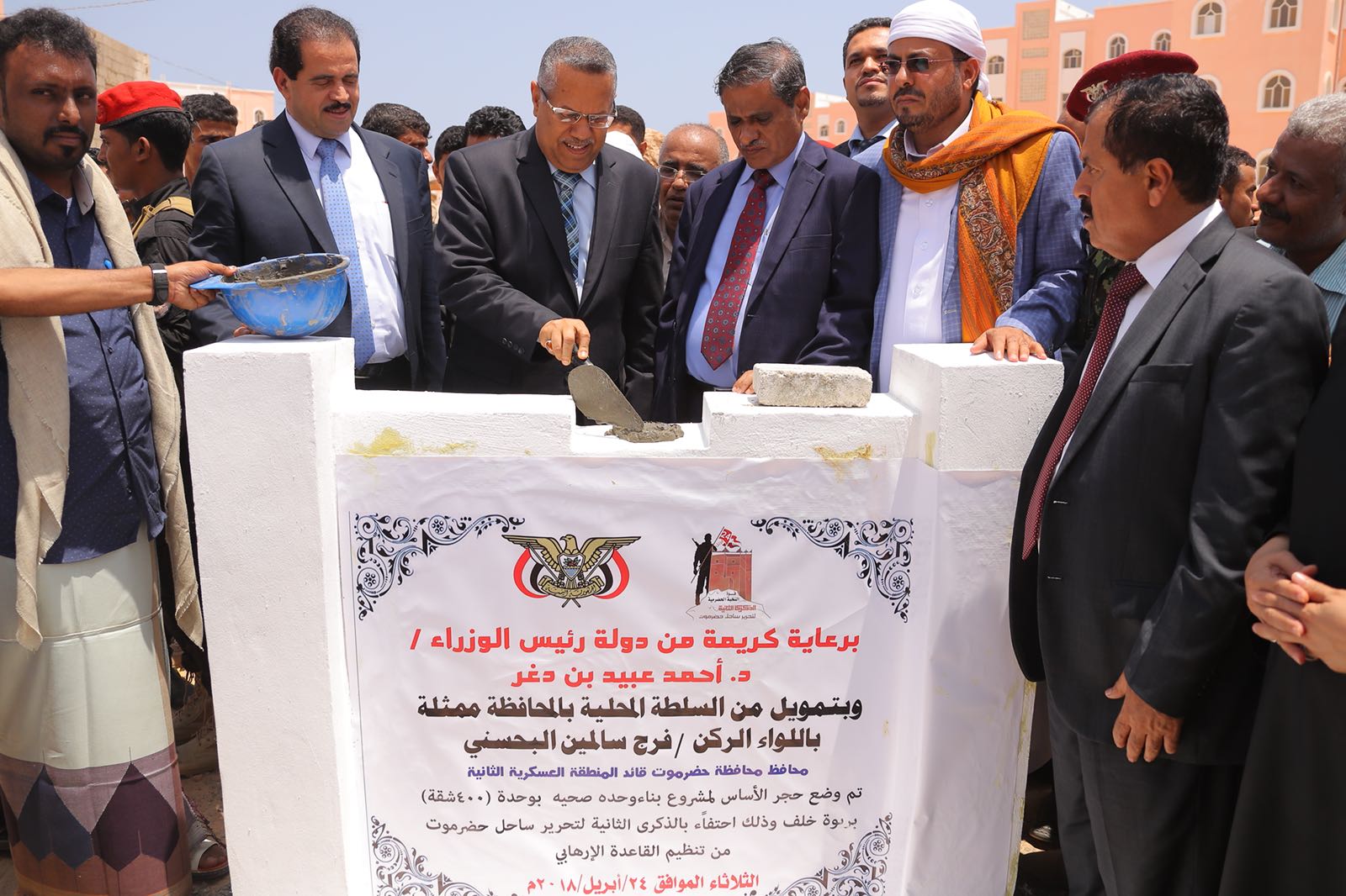 وضع رئيس الوزراء، الدكتور حمد عبيد بن دغر بوضع حجر الأساس لمشروع بناء مجمع تربوي بوحدة 400 شقة احتفاء بالذكرى الثانية لتحرير ساحل حضرموت من تنظيم القاعدة الإرهابي.