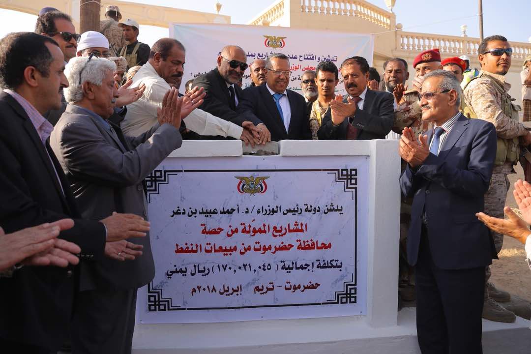 دشن رئيس مجلس الوزراء الدكتور أحمد عبيد بن دغر، اليوم، عدد من المشاريع الممولة من حصة محافظة حضرموت من مبيعات النفط بمديرية تريم، وبتكلفة إجمالية بلغت (170021045) ريال يمني.