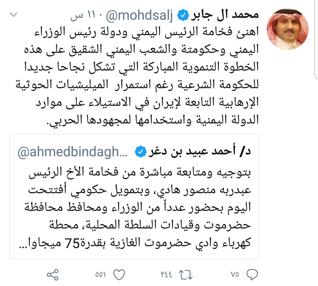 واضاف بالقول :” اهنئ فخامة الرئيس اليمني ودولة رئيس الوزراء اليمني وحكومتة والشعب اليمني الشقيق على هذه الخطوة التنموية المباركة التي تشكل نجاحا جديدا للحكومة الشرعية رغم استمرار الميليشيات الحوثية الإرهابية التابعة لإيران في الاستيلاء على موارد الدولة اليمنية واستخدامها لمجهودها الحربي.