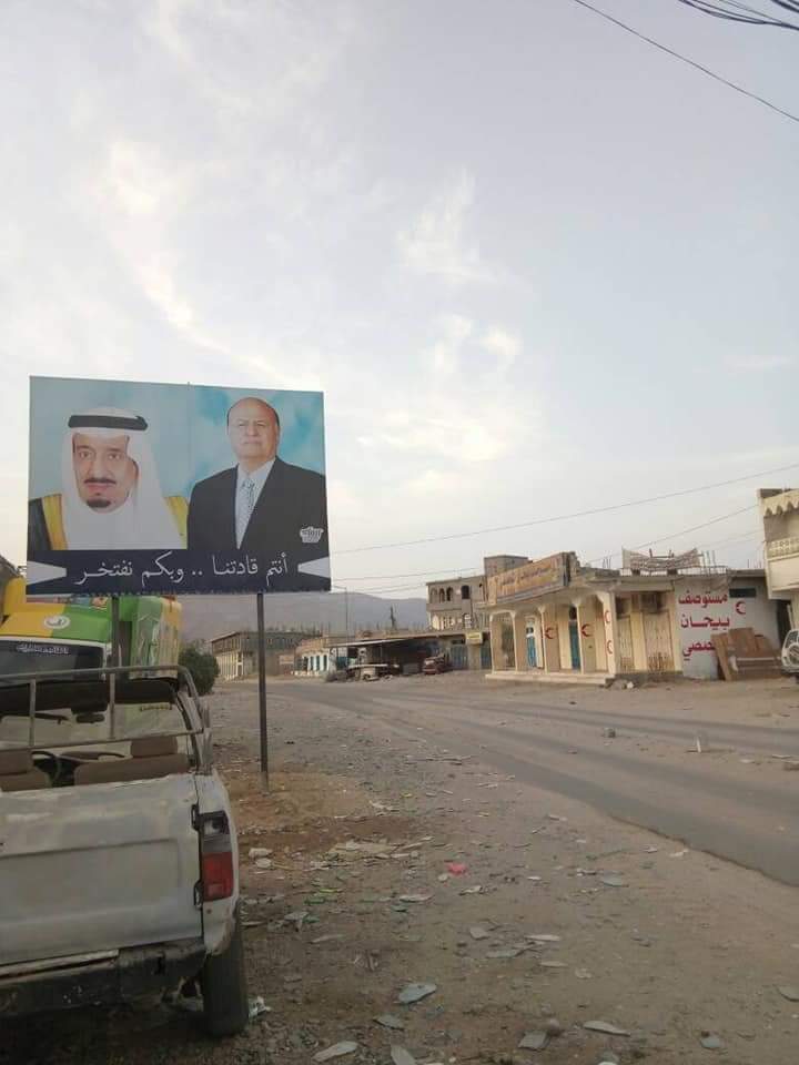 بعبارات انتم قادتنا وبكم نفتخر تزينت مداخل مدينة بيحان بصور الزعيمين الرئيس عبدربه منصور هادي والملك سلمان بن عبد العزيز في منظر جميل ومعبر عن شكر وامتنان بيحان وأهلها لقادة الحزم والعزم على ماقدموه لبيحان حتى تحررت من دنس المليشيات الإنقلابية الحوثية.